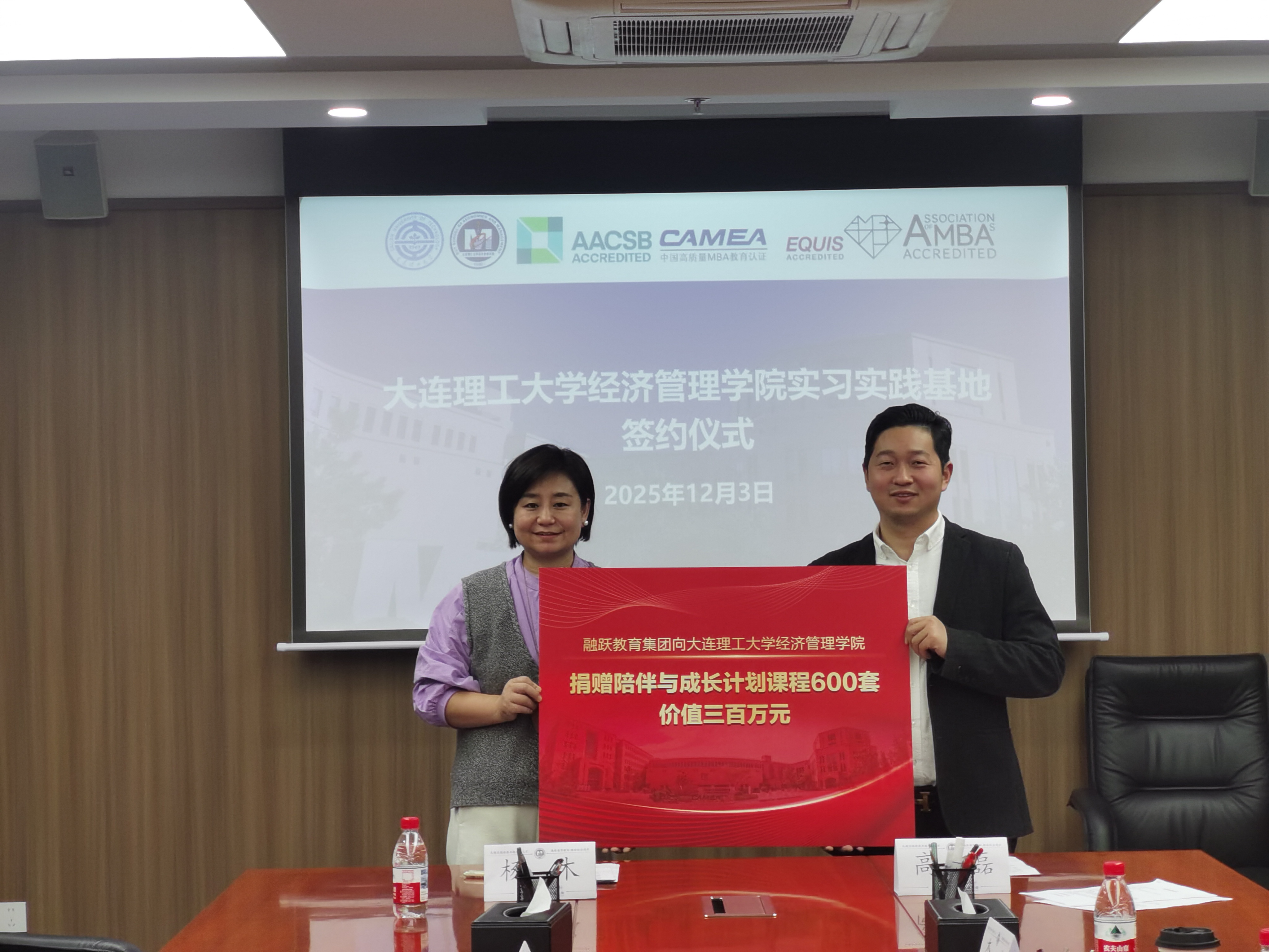 2025年12月3日,融跃教育集团与大连理工大学经济管理学院达成深度合作,在大连理工大学举行“陪伴与成长计划”课程捐赠暨实习实践基地授权仪式。融跃教育董事长高磊代表公司向学院捐赠600套价值三百万元的精品课程,经济管理学院党委副书记、副院长杨木代表大连理工大学经济管理学院接受捐赠,并确立融跃教育为本院实习实践基地,开启校企协同育人新篇章。