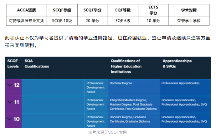 SCQF是英国四大学历框架之一(英格兰与北爱尔兰RQF,威尔士CQFW,苏格兰SCQF及爱尔兰NFQ-Ireland),其第10级对应苏格兰地区的荣誉学士学位,同时与欧盟资格框架(EQF)第6级及欧洲学分互认体系(ECTS)对接,全球通用性强。下表清晰展示了该文凭在国际框架中的定位: