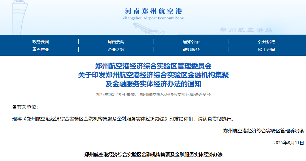 为推动区域性航空金融中心建设,积极落实《郑州市人民政府关于建设国家区域性现代金融中心的实施意见》(郑政〔2022〕18号),吸引金融机构在航空港区集聚,提升金融服务实体经济质效,构建以金融业为主导的现代服务业体系,结合航空港区实际,郑州航空港经济综合实验区管理委员特制定《郑州航空港经济综合实验区金融机构集聚及金融服务实体经济办法》。