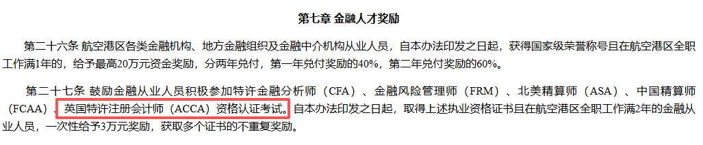 《郑州航空港经济综合实验区金融机构集聚及金融服务实体经济办法》第二十七条明确提出鼓励金融从业人员积极参加ACCA等资格认证考试。自本办法印发之日起,取得ACCA等资格证书且在航空港区全职工作满2年的金融从业人员,一次性给予3万元奖励。