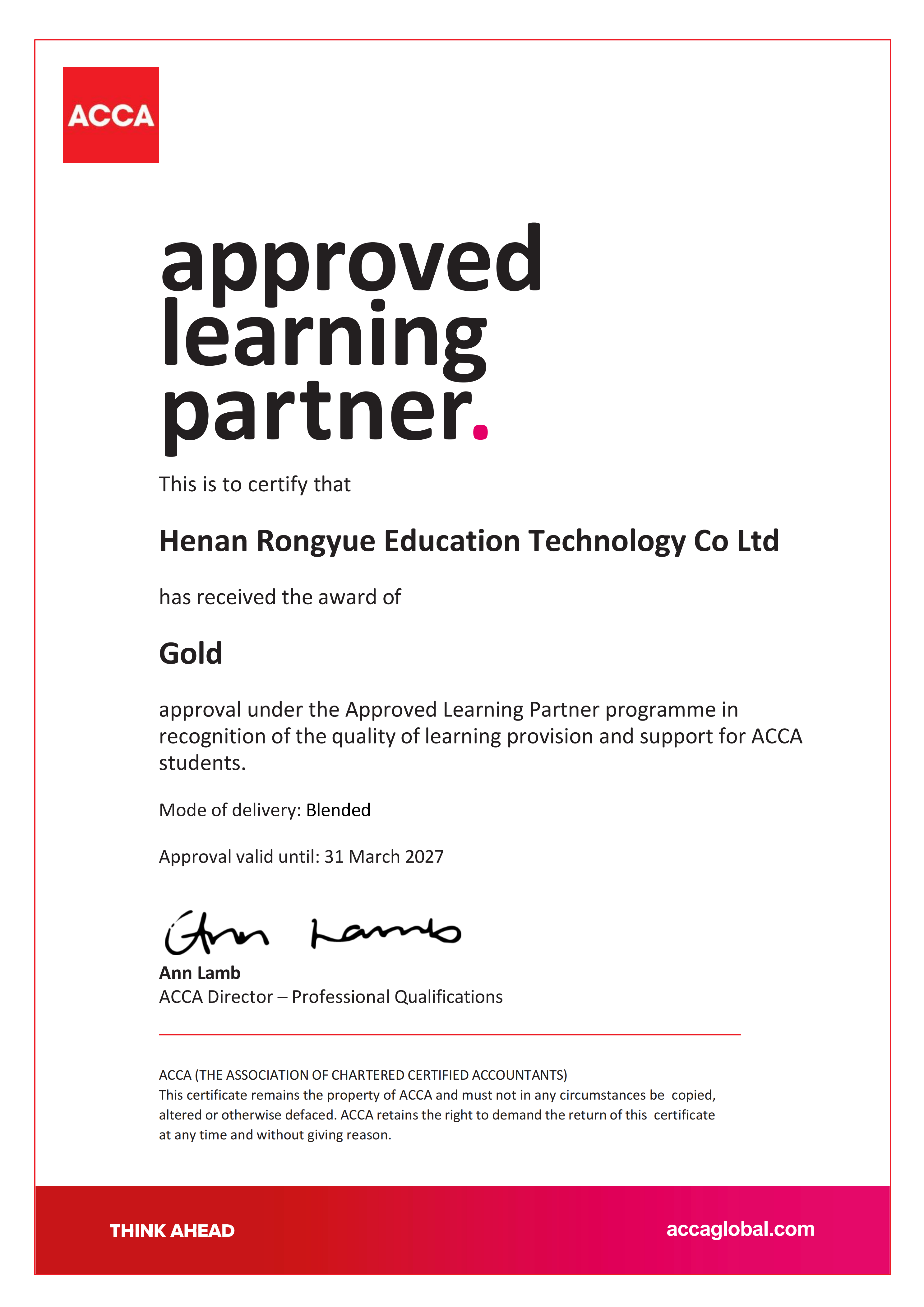 ACCA 认可培训机构(ALP)黄 金级认证需满足多项刚性指标:50% 以上 ACCA 科目通过率持续超过全球平均水平,教学管理、课程设计、学员服务等全流程符合 ACCA 全球统一标准,并通过协会年度续期审核与定期监督视察。作为国际财会培训领域的重要资质背书,该认证是学员选择优质培训机构的核心参考,也代表着行业对机构综合实力的高度认可。