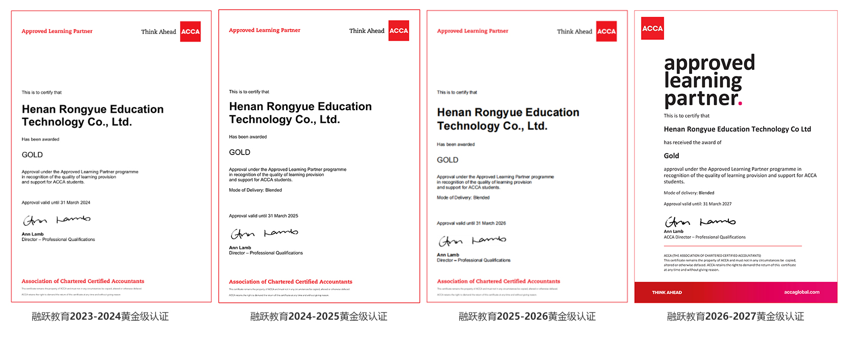融跃教育自 2015 年进军国际财经培训领域以来,已连续多年通过 ACCA 认可资质审核。此次再度获评黄 金级认证,得益于其在通过率、师资建设、教学创新等方面的持续突破。