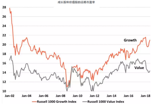 虽然像上面这样的历史收益对比图很有说服力,但关于价值股和成长股未来可能带来的回报,并没有提供多少有价值的参考。我们还是看一张估值表。下图使用汤森路透Eikon数据库描述的是成长股和价值股的远期市盈率(P/E),数据来源延伸至2002年1月。