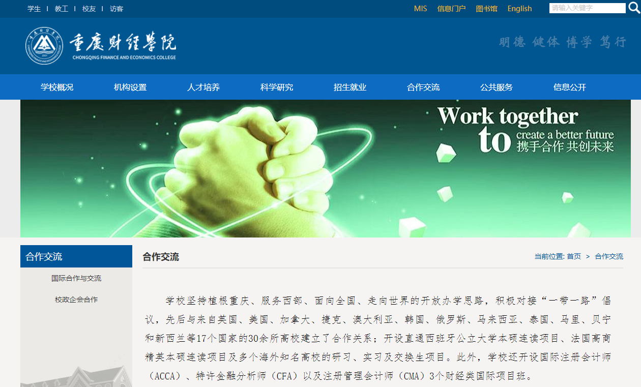 重庆财经学院开设CFA专业,凭此证书可应聘投行、证券公司、基金、外企、上市公司、金融机构、世界500强等企业工作,从事国际高级金融分析、投资与管理工作。
