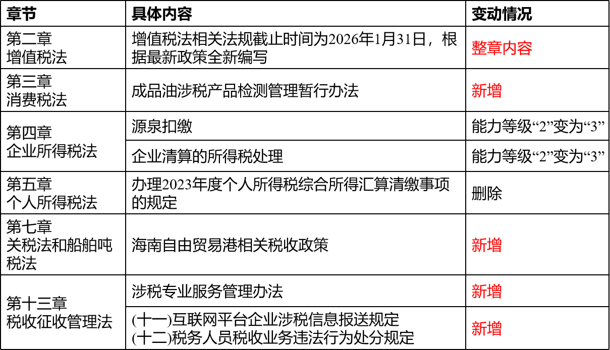 章节数量不变,第二章增值税变动较大,增值税法相关法规截止时间为2026年1月31日,教材内容根据最新政策全新编写,需要考生们重点关注,第十三章税收征收管理法增加两节内容,分别为:互联网平台企业涉税信息报送规定和税务人员税收业务违法行为处分规定。其余章节变动不大。具体变动情况请参照下表: