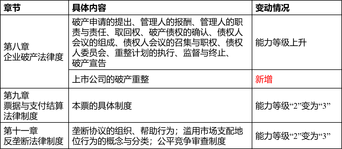 章节数量不变,主要是上调了部分章节知识点的能力雷达等级,着重关注第八章企业破产法律制度新增“上市公司的破产重整”内容,其余章节无实质性变动。具体变动情况请参照下表: