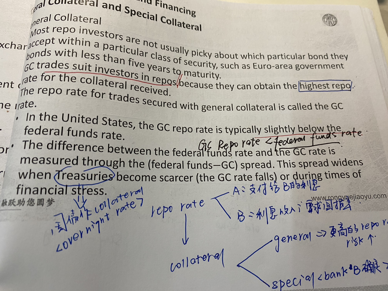 同学你好,GC是有抵押的利率,而federal funds rate是无抵押的利率,有抵押品的风险更低,所以其利率相对更低一些。