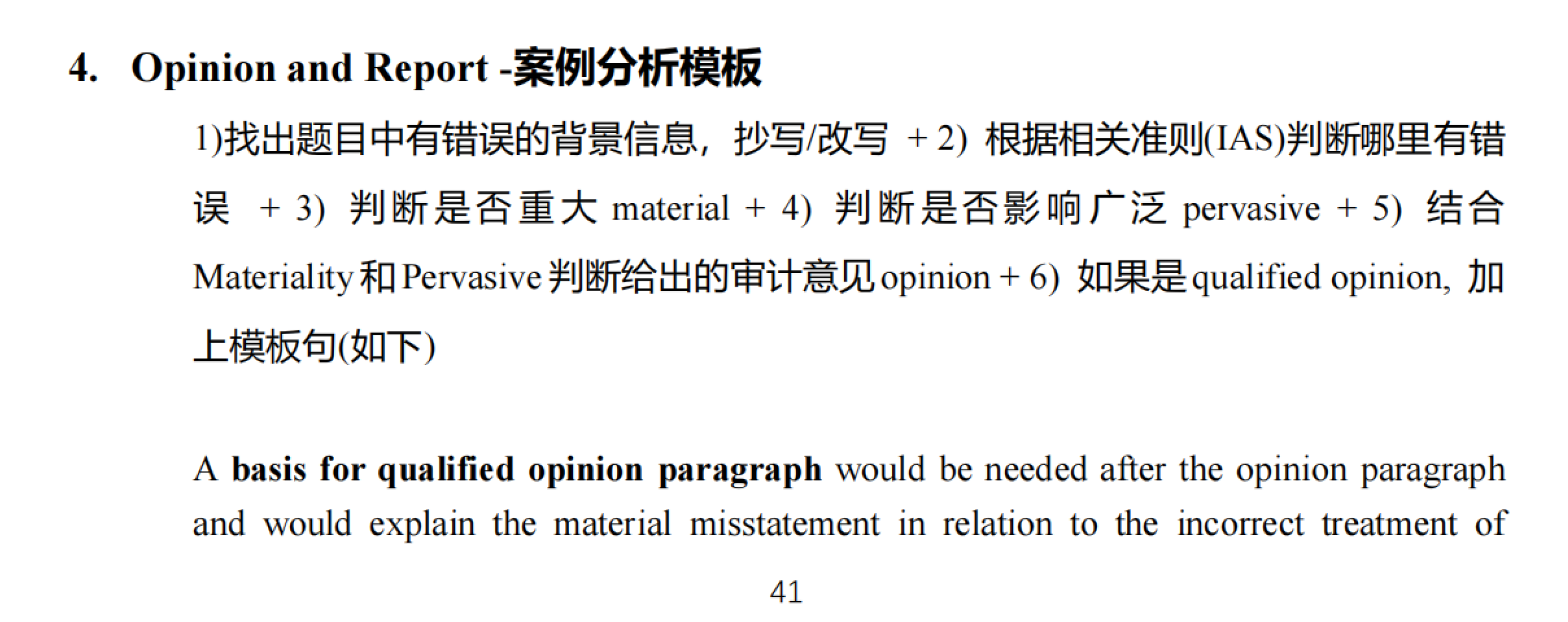 September/December 2017 Q18 改写答案 Solution: 1. 写问题(简单的直接抄事件,复杂的需要写会计条款),并写影响 1分 The company has included a redundancy provision of $110,000 in the draft financial statements, however, audit fieldwork testing has confirmed that the provision should actually be $305,000. (抄事件)The provision is understated and profit before tax overstated if the finance director does not amend the financial statements. (写影响) 2. 计算 materiality 与 profit 进行比较 1 分 The provision included is $110,000, it should be $305,000 hence an adjustment of $195,000 is required which represents 7.5% of profit before tax (195/2,600) or 1.1% of total assets (195/18,000) and hence is a material matter. 3. 判断属于哪种情况 material but not pervasive or material and pervasive 1 分,给出报告结论 1 分,给出报告格式 1 分 If management does not adjust the redundancy provision, the auditor’s report will need to be modified. As provisions are understated and profit overstated, there is a material misstatement, which is not pervasive.(判断属于哪种情况) Therefore, a qualified opinion would be necessary, (给出报告结论)stating that the opinion is qualified ‘except for’ and the basis for qualified opinion should be followed.(给出报告格式 )