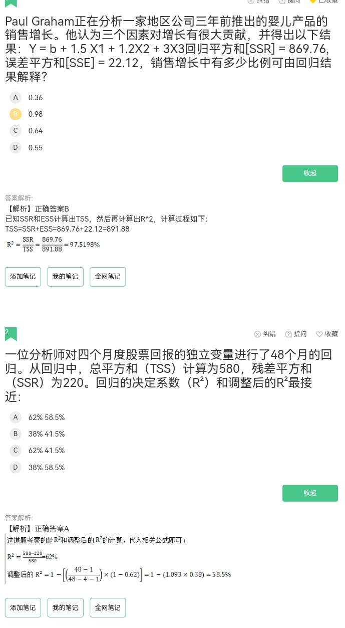 第一道题的SSR是回归平方和(也就是解释平方和),是可以作为R方的分子的,第二道题的SSR是残差平方和的缩写,是不能直接作为R方计算公式分子的。要看中文翻译或者英文的全称,不要看缩写。
