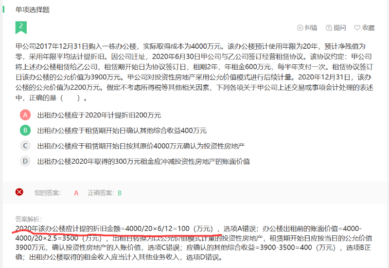 因为6月30日之后将办公楼出租出去了,固定资产变为投资性房地产,且甲对投资性房地产采用公允价值模式进行后续计量,所以在甲的账面上要将固定资产转为以公允价值模式计量的投资性房地产,投资性房地产采用公允价值模式进行后续计量的,不需计提折旧或摊销,也不需要计提减值准备,所以账面上只计提半年的折旧