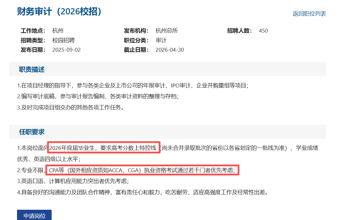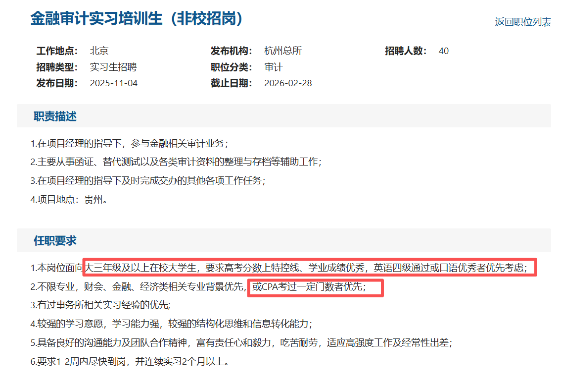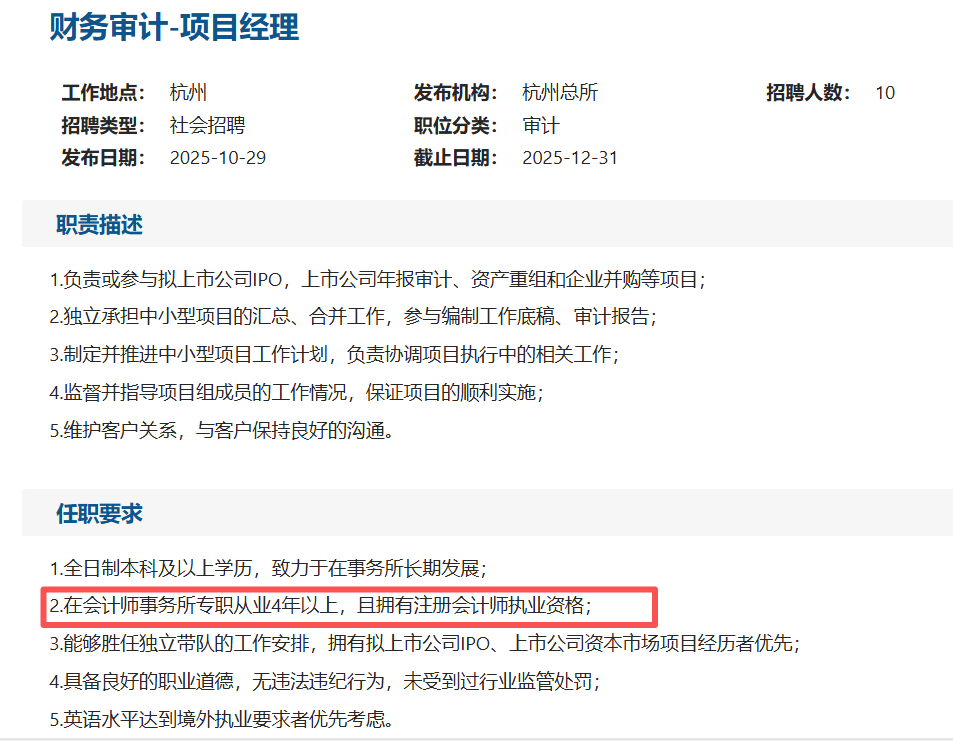 不少事务所校招和实习岗:哪怕是实习生,也优先CPA过科的同学;校招更直接把“CPA通过若干门”列为加分项;社招里,项目经理岗更是把CPA持证设为硬性门槛。这意味着,从大三开始,你的职业准备就得“证书+实习”双管齐下。