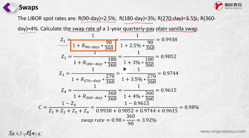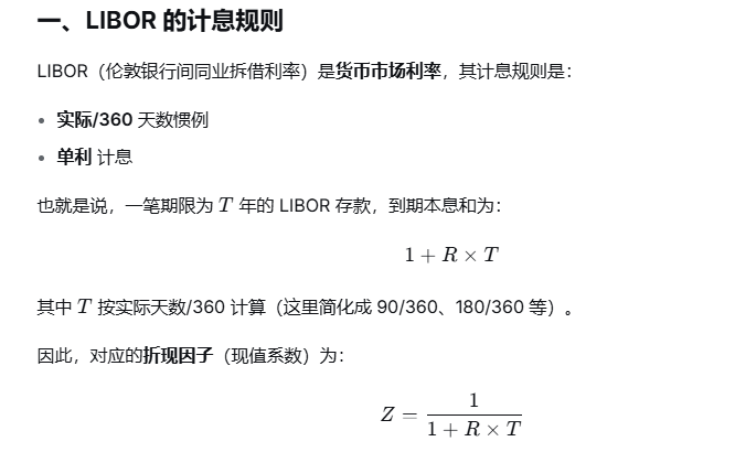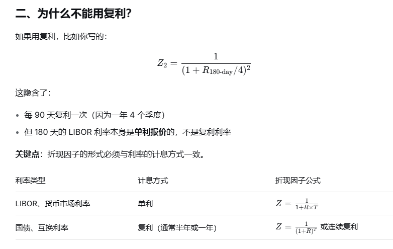 考试中,基本都会明确用单利还是复利,是一般复利还是连续复利。除非题目明确说明用复利(如"continuous compounding”"annual compounding”),否则利率默认按单利处理的情况只有一种:涉及LIBOR、货币市场利率、FRA等短期利率的场景。更准确地说:不是“只有FRA用单利”,而是“凡是基于货币市场利率(如LIBOR)的产品,都用单利;凡是基于国债利率、互换利率、连续复利模型的,都用复利"。因为货币市场利率基本都是小于一年的,单利和复利的差异不大,更多是遵循市场惯例用单利。
