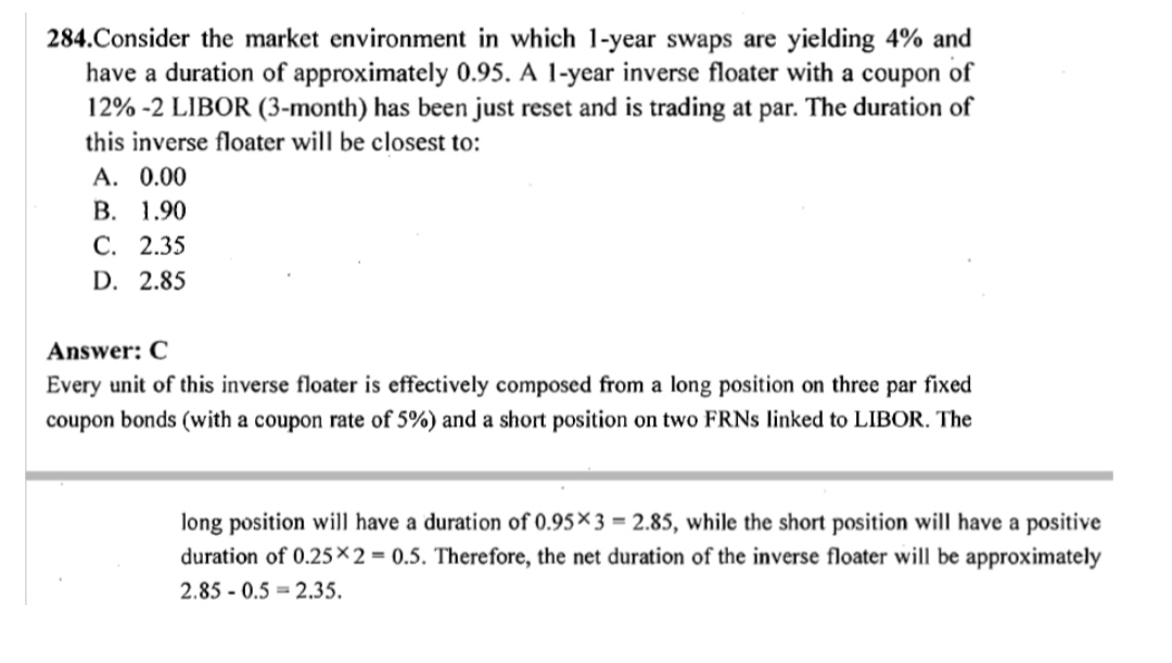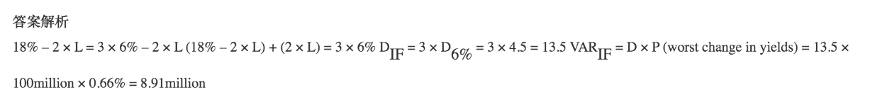 这道题求的是反向浮动利率债券久期的计算,第一步需要用反向浮动利率债券和浮动利率债券去构造固定利率债券,并根据浮动利率债券的久期为零,计算出反向浮动利率债券的久期,在根据delta-normal法去计算VaR值