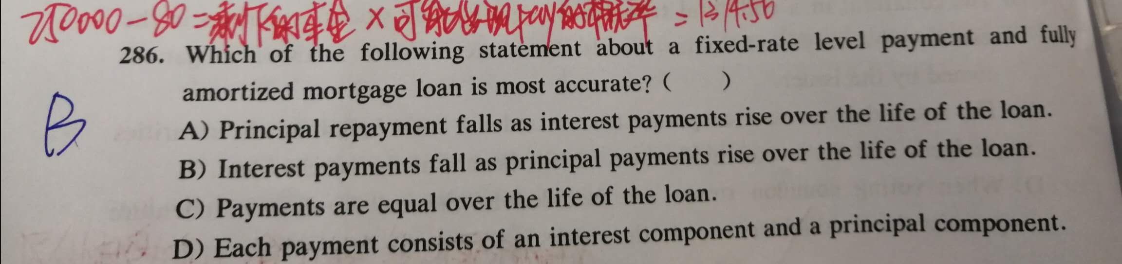 同学,payment是不变的,开始的本金付的多,然后随着时间后移,每笔payment里面含有的interest 下降,principal 增加