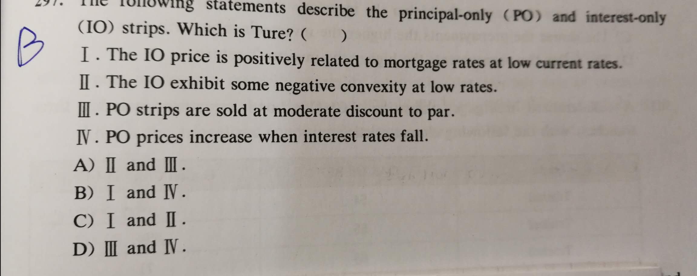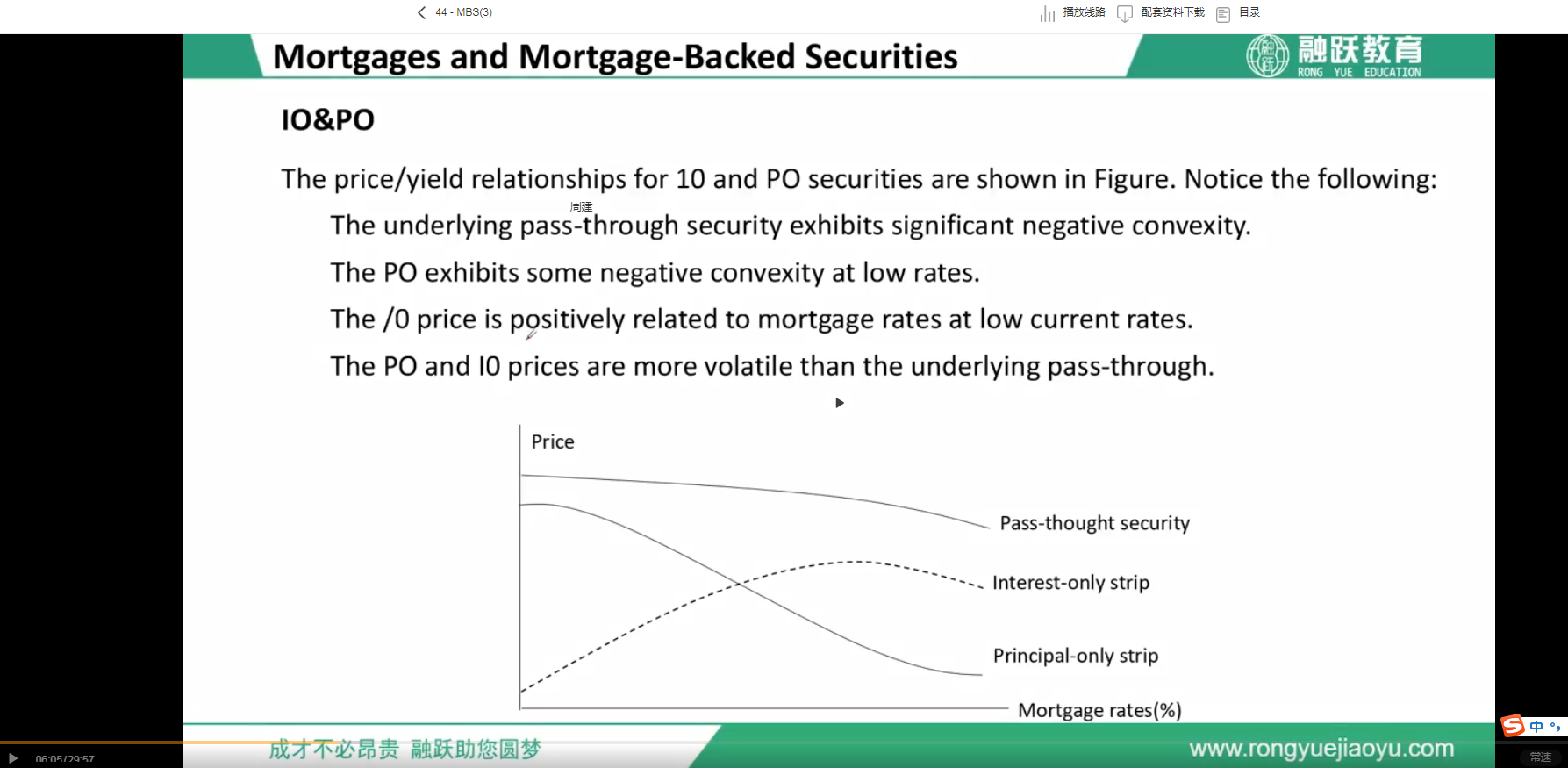 IO是是呈现出一个负久期的特征,即利率下降,IO价值下降;而PO只有在利率下降时才会呈现出负凸度(因为提前偿还导致PO价值下降)。