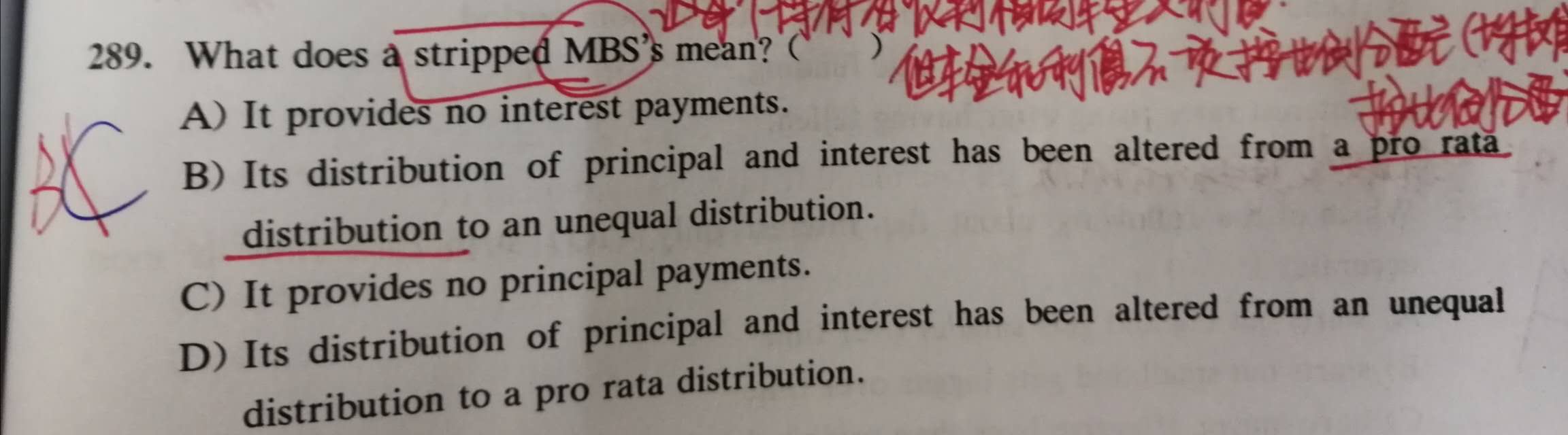pass through的持有份额在现金流没有分层(即分为优先级和次级)的时候是一样的,如果分层,收益率就会不一样,优先级的收益低但风险低,次级的收益高风险大。MBS-sripped 是剥离式MBS(stripped MBS,SMBS),又分为利息型IO(Interest Only)和本金型PO(Principal Only),其将现金流的本金和利息分离开并分别支付给相应的投资者,每份份额是一样的。pro rata是按比例的意思。
