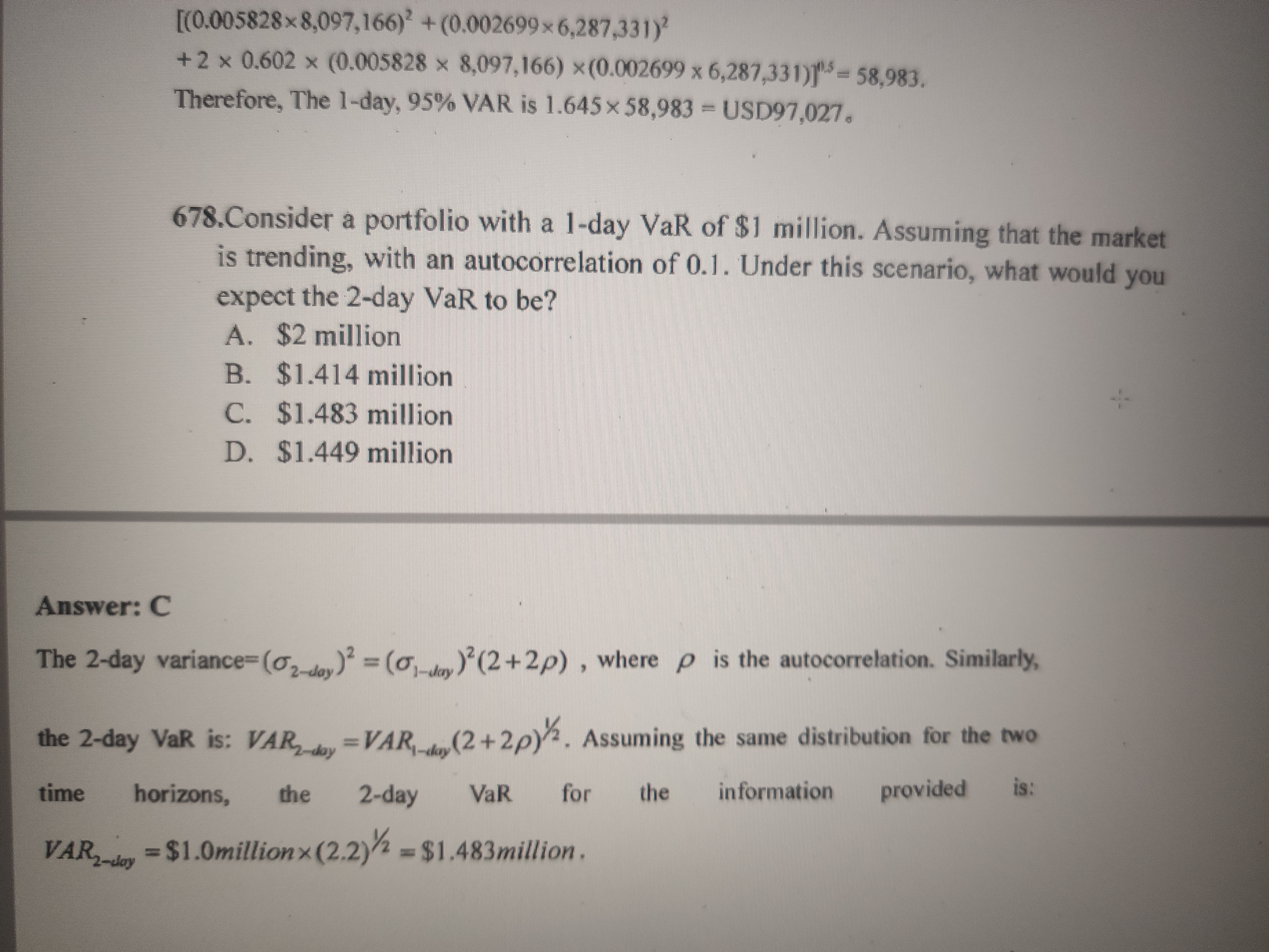 同学,在平方根法则中,VAR(t)=VAR(1)*t^0.5,是在独立同分布的假设下;实际上是乘以[t*(1+ρ)]^0.5
