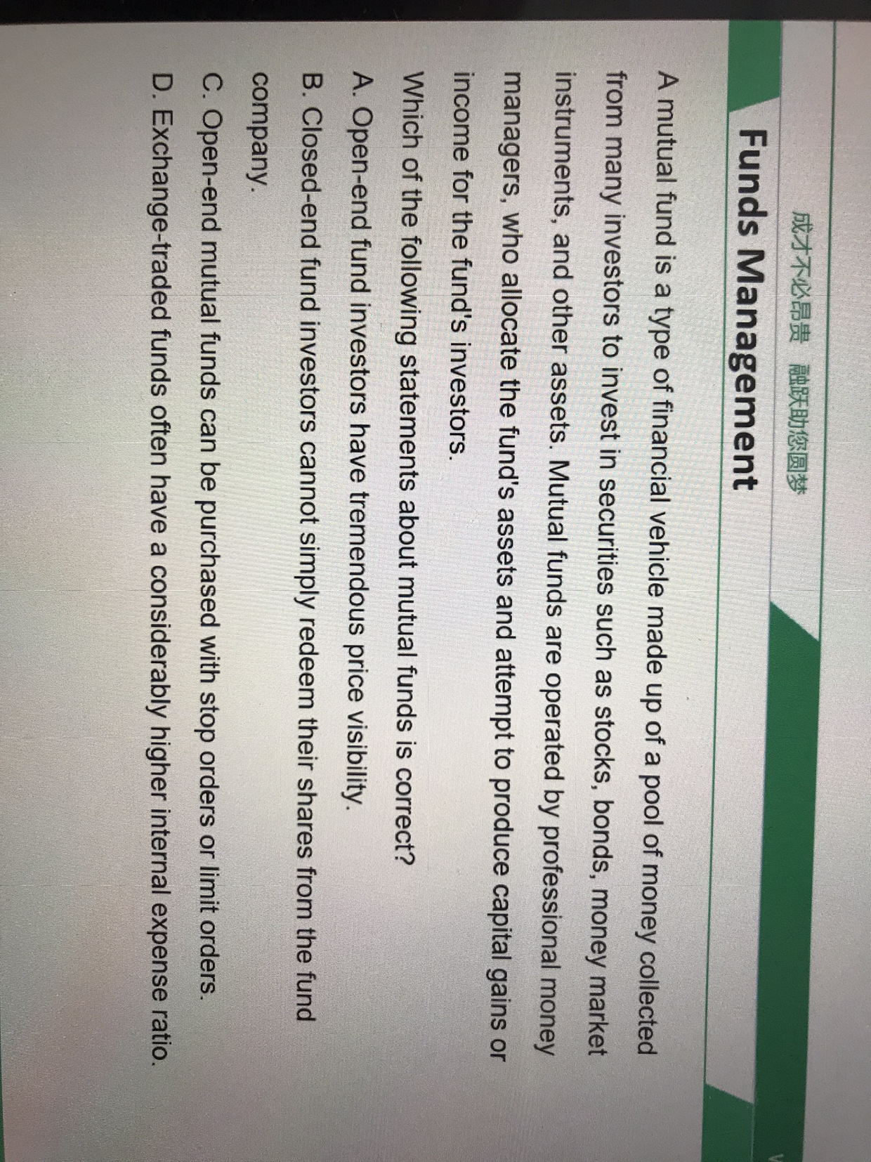 同学你好,A说的是开放式基金投资者对价格有极高的可视性,指的就是价格的透明性。 B说的是封闭式基金投资者不能简单地从该基金赎回他们的股票公司(只能在封闭期结束后赎回)。C说的是开放式共同基金可以通过止损单或限价单购买。 D说的是交易所交易基金的内部费用比率通常要高得多。