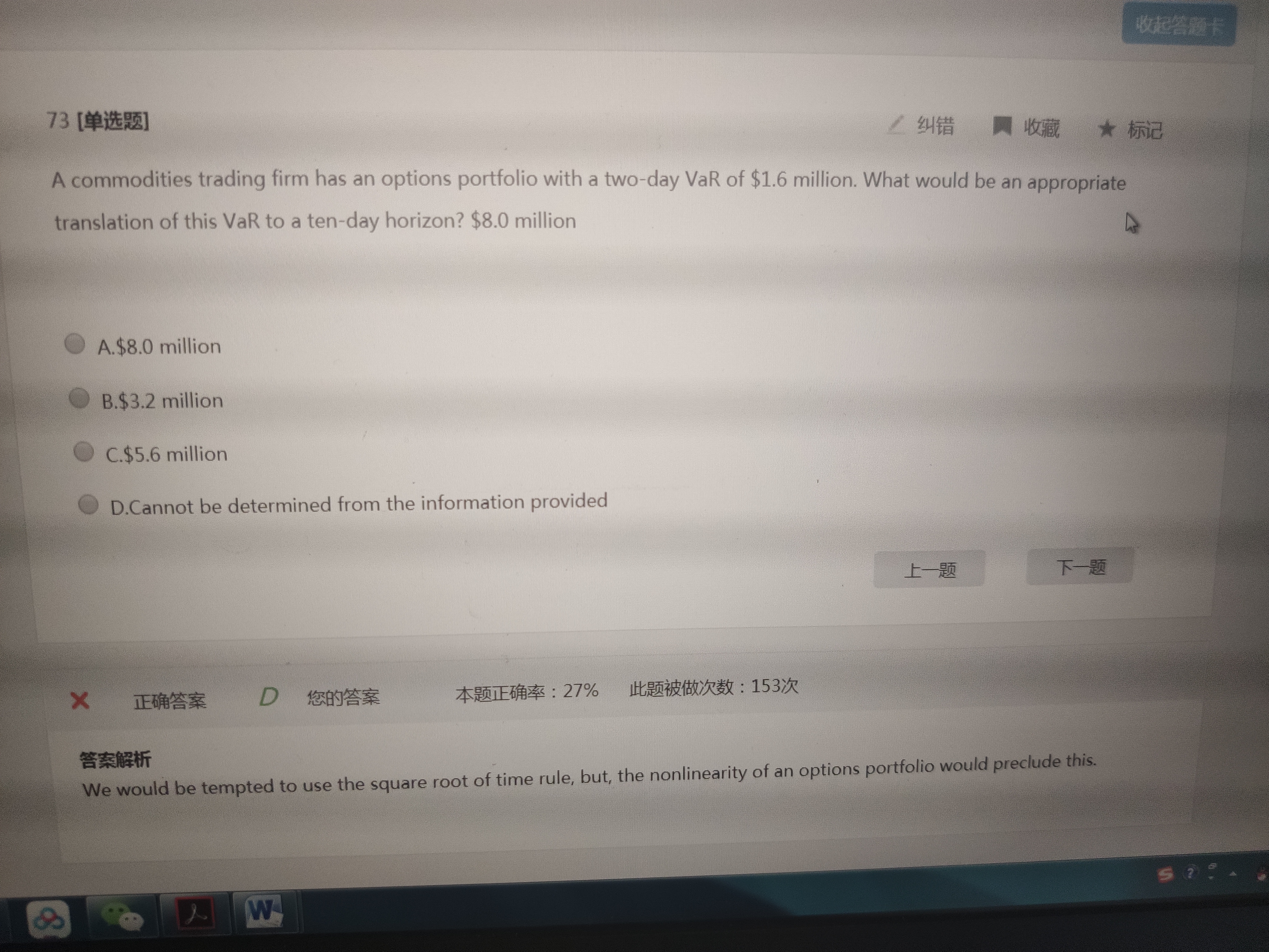 答案是D,因为对于期权的VaR需要知道delta和gamma才能用delta-gamma法去计算,题目给的条件明显不够。