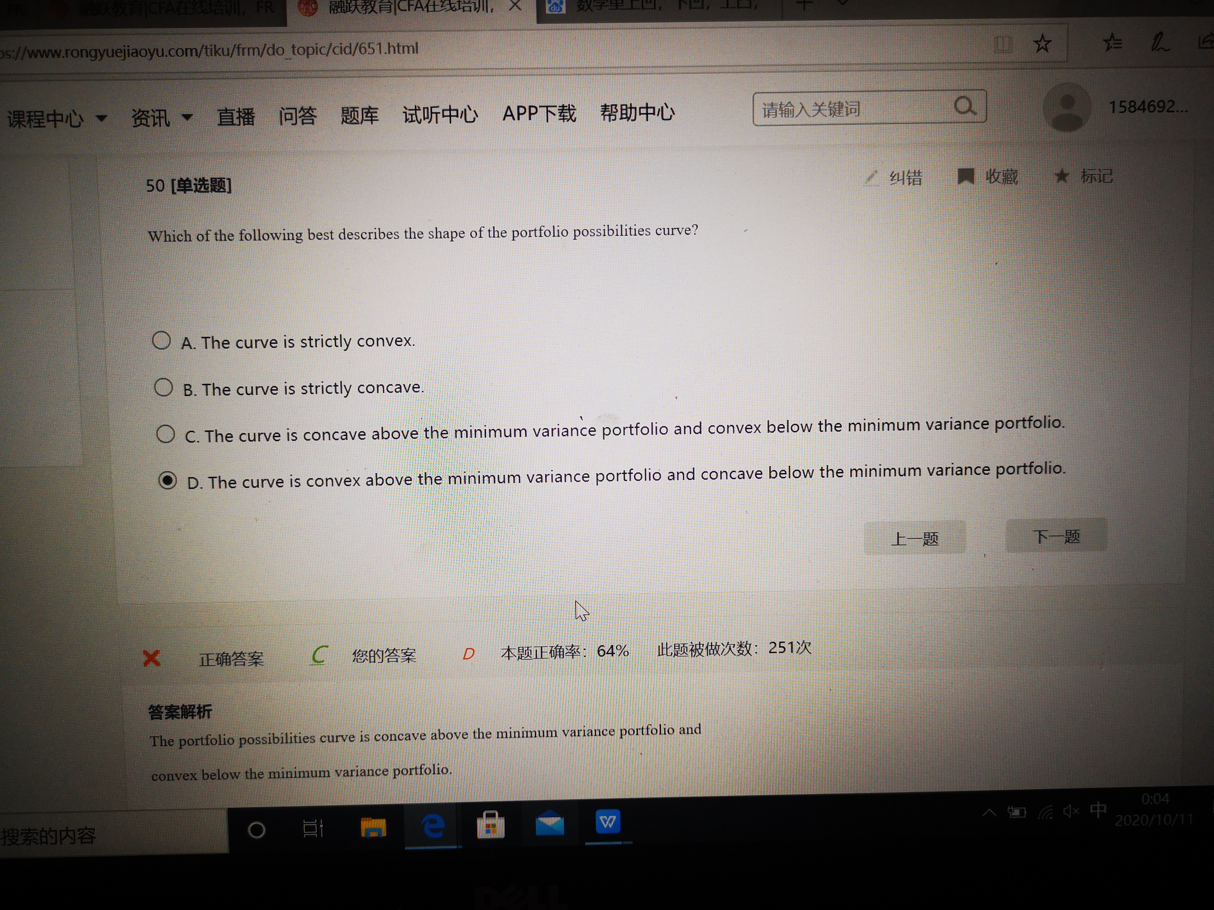 同学你好,C选项说的是在马科维茨有效前沿上凹的部分是在最小方差组合点以上的部分,而凸的部分是在最小方差组合点之下的部分,所以是正确的。