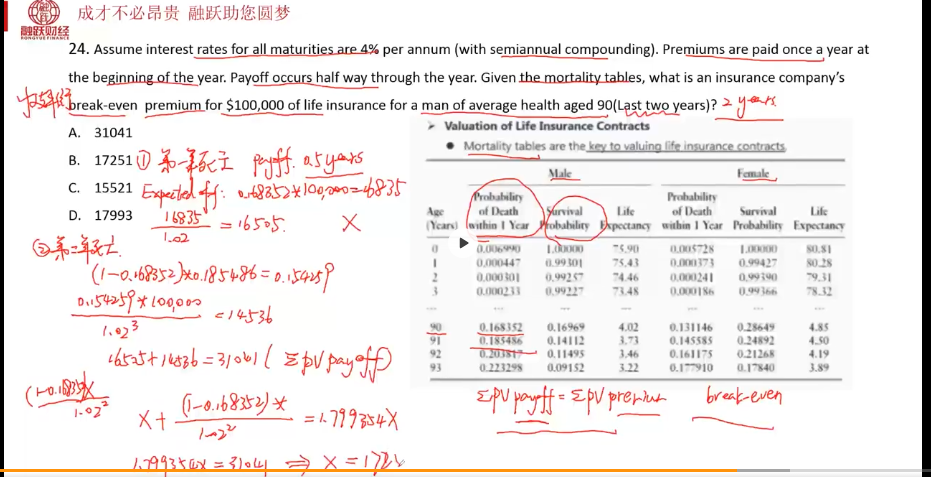 同学你好,在算保费收入的时候,一般都是默认年初交保费,所以第一期保费收入是不考虑死亡概率的,第二期保费收入也是在年初缴纳的,所以只用考虑第一年不死亡的概率就可以了,因为第二年年初就缴纳保费了,同样的折现也就只用往前折现一年就可以了。