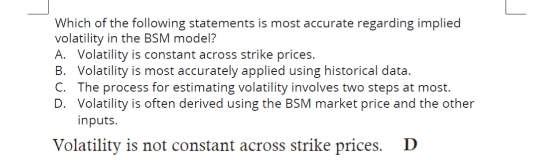 同学你好,这道题题干说的是关于在BSM模型中的隐含波动率哪个说法是正确的,因为隐含波动率是通过观察市场上期权的价格并根据BSM模型的其他几个输入变量倒退出来的。所以volatiliyg不是常数。注意这道题说的是隐含波动率不是BSM模型中波动率的假设条件。