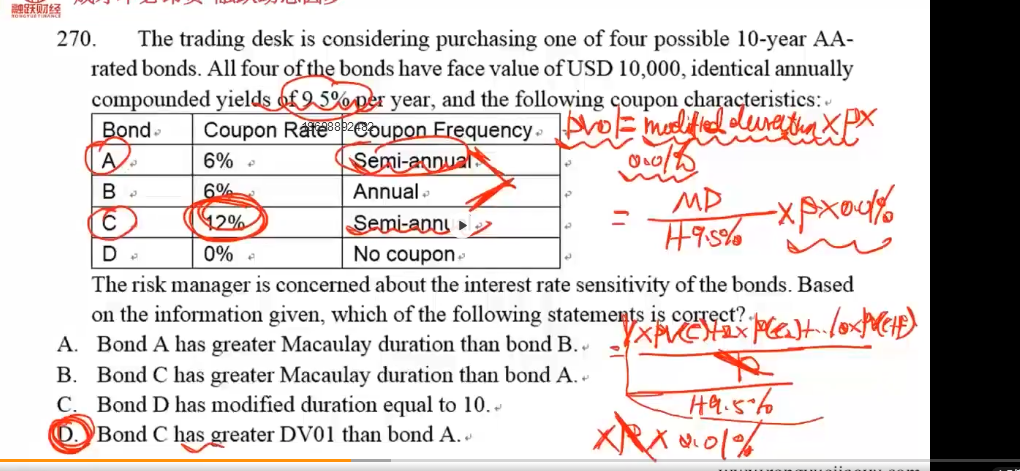 同学你好,首先麦考利久期heDV01变动的方向不一定是相同的,因为DV01=麦考利久期/(1+r)*P*0.01%,DV01的变动除了要看麦考利久期还要看P,所以再讲选项D的时候通过推导特意剔除了麦考利久期heP的影响,只留下现金流折现求和的数值这一个影响因素,票息率越高,现金流折现求和的数值就越大,DV01就越大,所以说不矛盾。
