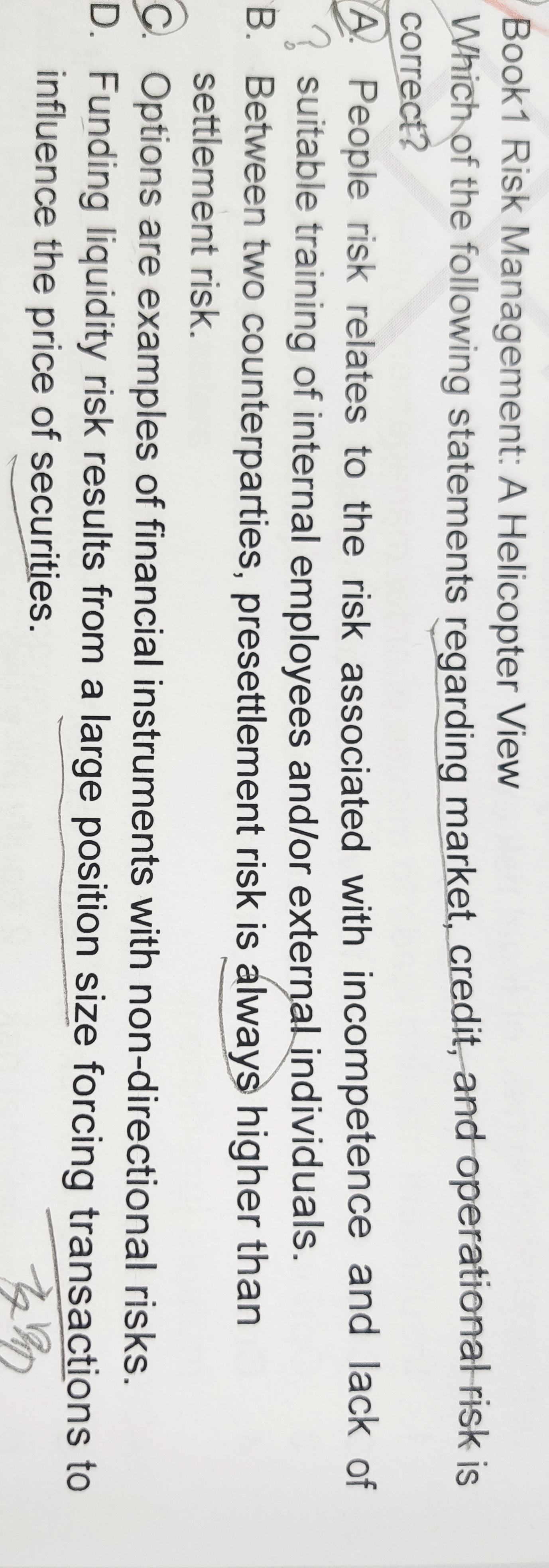 同学,A选项意思是人员风险是与内部员工和/或外部人员缺乏适当培训相关的风险,是错误的哈,操作风险中的员工风险是与人为错误相关的风险;C选项知识点已经从考纲中删除,可以忽略