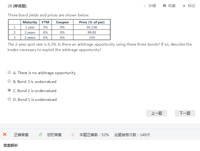 这道题考察的知识点其实是债券的构造,通过两个零息债来构造付息债。通过0.06份的一年期零息债+1.06份的2年期零息债来构造2年期的付息债的现金流。用0.06*95.238+1.06*99=110.65428这个值大于2年期付息债的价格100。所以要么两个零息债的价格被高估,要么2年期付息债的价格被低估。题干中说市场两年期的即期利率变化到6.2,%,这个显然对一年期零息债的价格没影响(而且你可以用计算器算一下,这个价格是刚好的),所以只有两年期的零息债的价格被高估了,或者两年期付息债的价格被低估了,从选项中你只能选B。这是考试做题的思路。