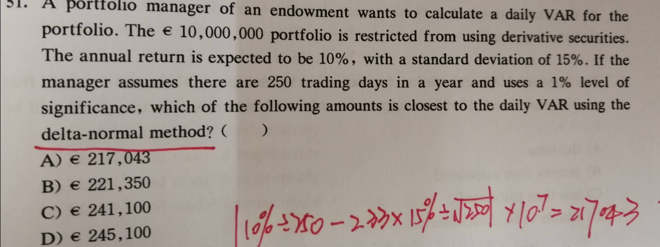 同学,1.理解delta-normal方法就好哈,这个题目有点不严谨;2.均值和方差的处理方式不同,均值直接除以天数即可,方差需要除以根号天数