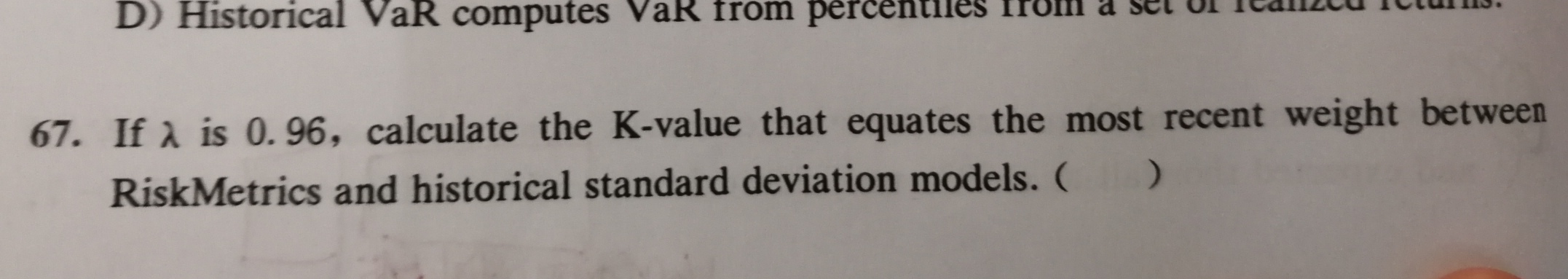 同学你好,Risk Metrics是EWMA,Risk Metrics中,第n天的数据权重是[λ^(n-1)]*(1-λ)
