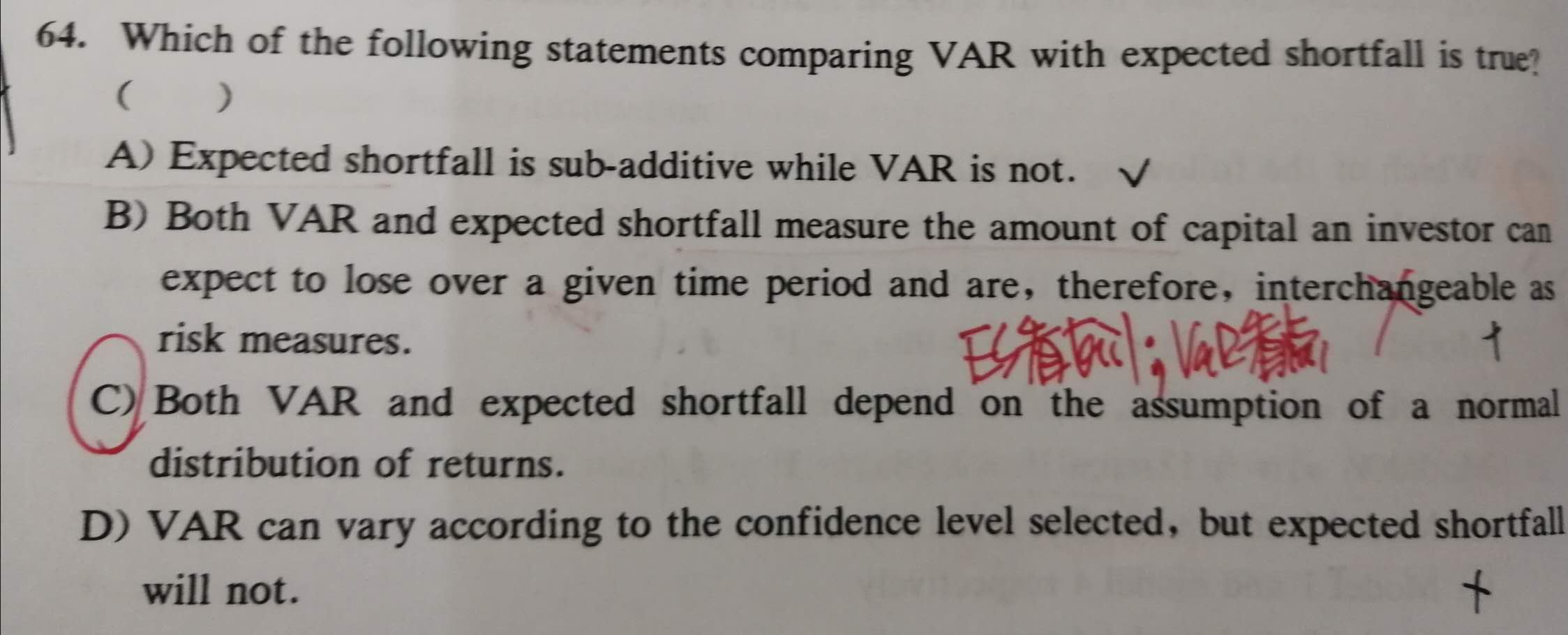 同学你好,VaR和ES没有假定服从正态分布哈,只是在用delta-normal法计算VaR时是假定服从正态分布的。