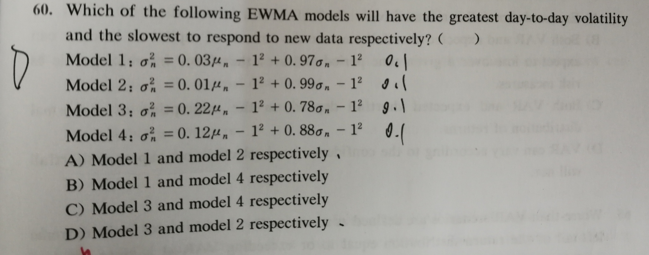 那EWMA衡量slowest to respond的指标是哪个?然后,题目是largest day to day volatility 对应model2,然后slowest to respond对应model 3吗?