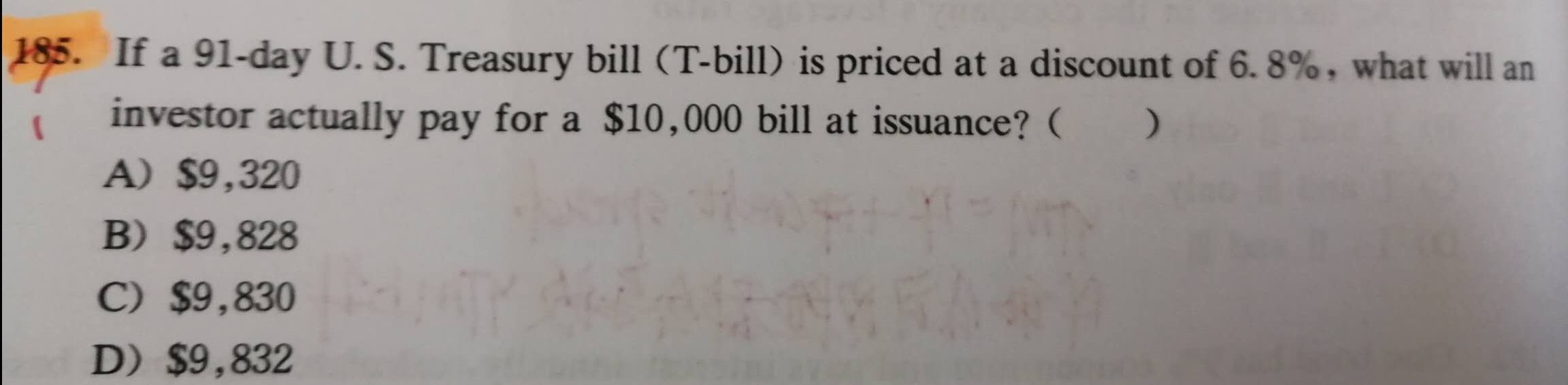 同学你好,pay for bill at issueance应该是pay for bill at initiate,就是说投资者要想在期末受到10000,按照题干中给的期限he收益率,期初应该花多少钱购买。10000/(1+6%*91/360)=9831