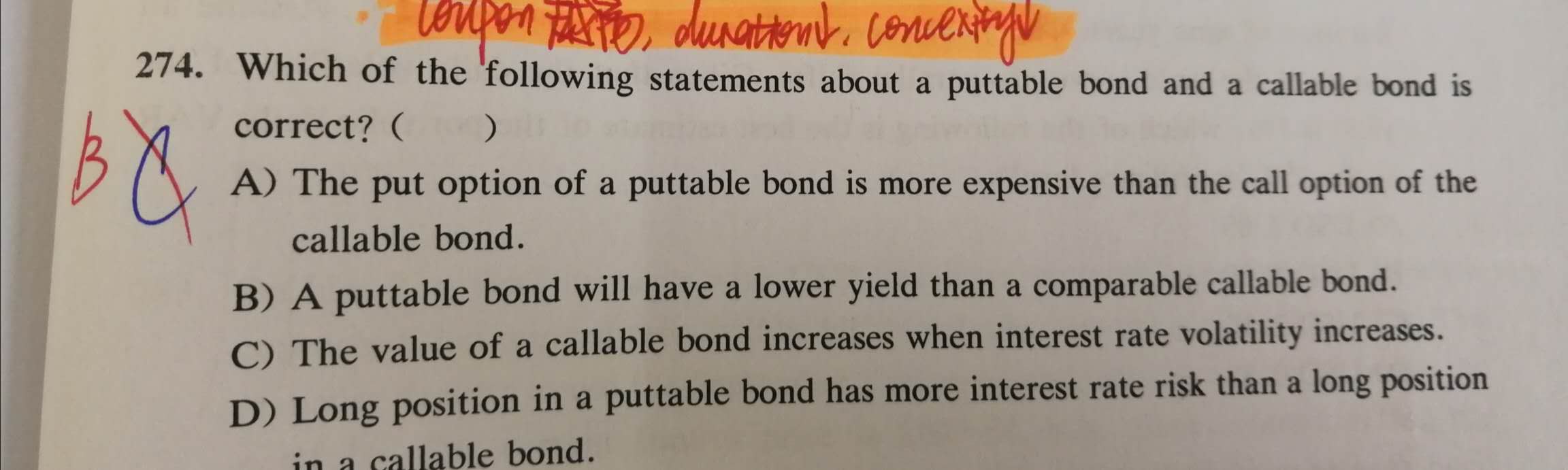 同学你好,同学你好,根据含权债券涨多跌少的性质,callable中call option的价值大于putable中put option的价值,所以A错,putable给了投资者一个期间退回的权利,所以会导致其收益率降低,所以B对;因为callable bond=straight bond-call option ,putable=straight bond +put option 所以,当利率波动较大时,call option和put option价值均上升,所以callable bond价值下降,putable bond 价值上升,所以C错;因为putable bond给了投资者一个可以提前退回的权利,所以其利率风险较小,D错。