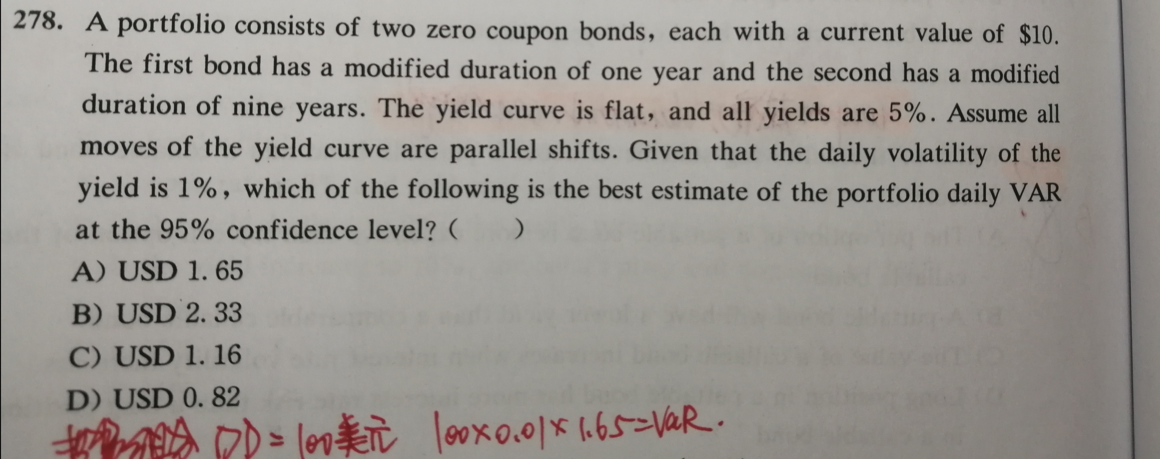 这个duration是怎么算出来=10的呢,一个久期是1,另一个久期是9,两个资产都分别占比50%,那组合的久期不就是5吗?那是不是应该等于:D*P*Z*δ=5*10*1.65*0.01?