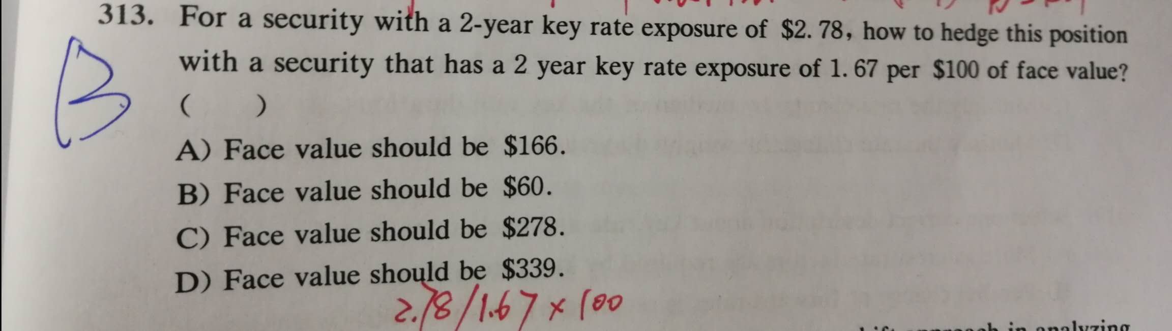 同学你好,对冲的基本原则就是对冲工具的敞口需要跟被对冲资产的敞口一致,根据题意,对冲公式应该是:2.78×面值=1.67×面值(100),只有一个未知数,即是要求的结果。