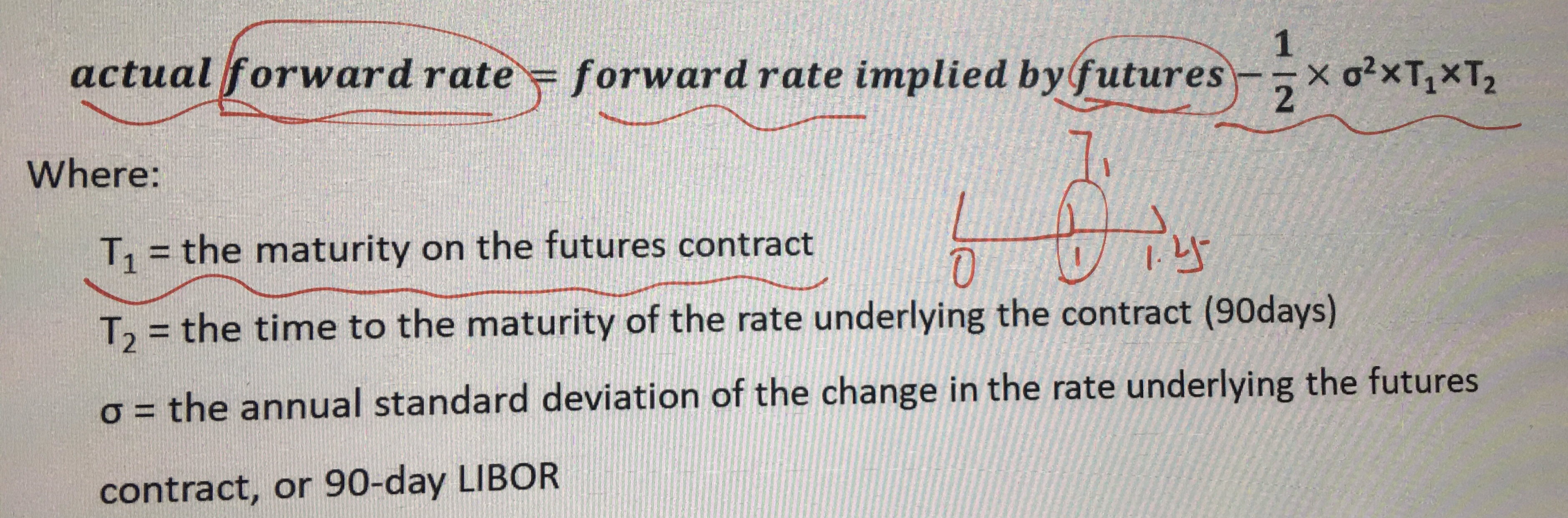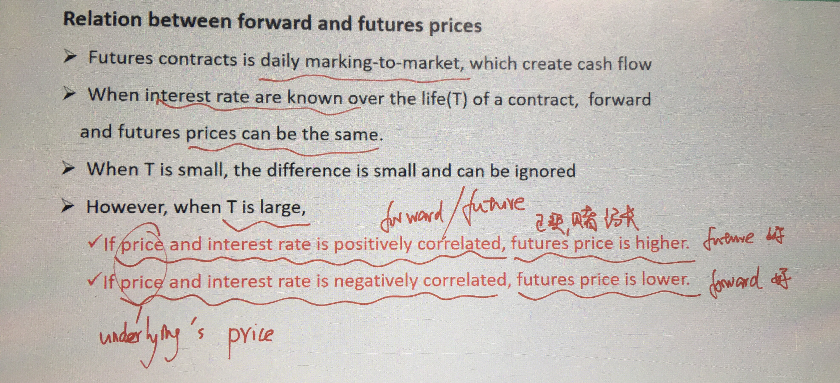 同学你好,因为期货每日结算制度的原因,当标的资产与利率正相关时,期货价格大于远期价格(因为期货可以把每日的结余提出来投资无风险利率资产获取收益),当标的资产与利率负相关时,期货价格小于远期价格(因为期货把每日的结余提出来投资的无风险利率收益降低);在欧洲美元期货中的凸度调整公式计算中,因为其标的资产是3个月的远期利率,大多数资产都是与利率成负相关,此时期货价格小于远期合约价格,则期货对应的远期利率大于远期合约对应的远期利率。