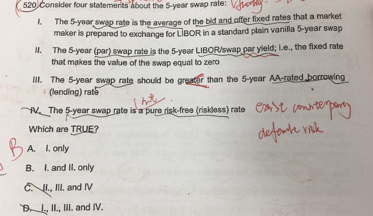 同学你好,第一个说法的意思是说5年的互换利率等于外汇市场中买价he买价的平均值,这是正确的,因为互换利率等于平价利率,而平价利率等于即期利率的加权平均,市场上的LIBOR可以近似为即期利率。第二个说法也是正确的,因为互换利率等于平价利率,互换的期初价值为0。