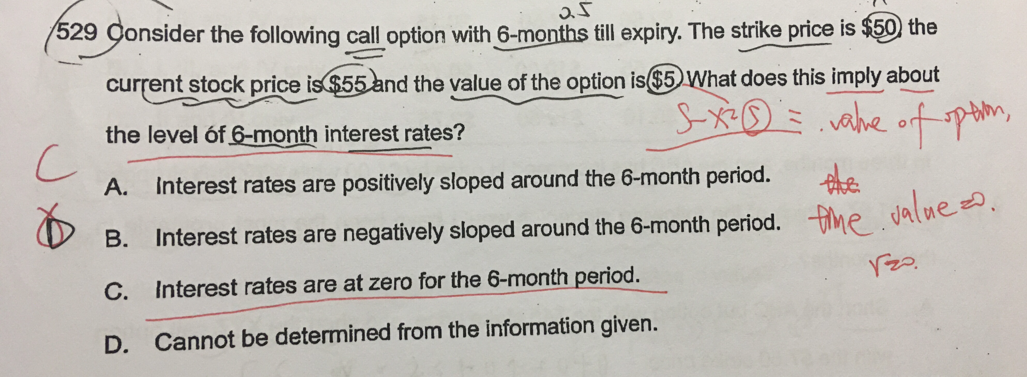 同学你好,call option的收益=S-K*e^rt,期权的价格可以近似等于期权的收益的现值。所以5=55-50e^-r*6/12,推出rf=0