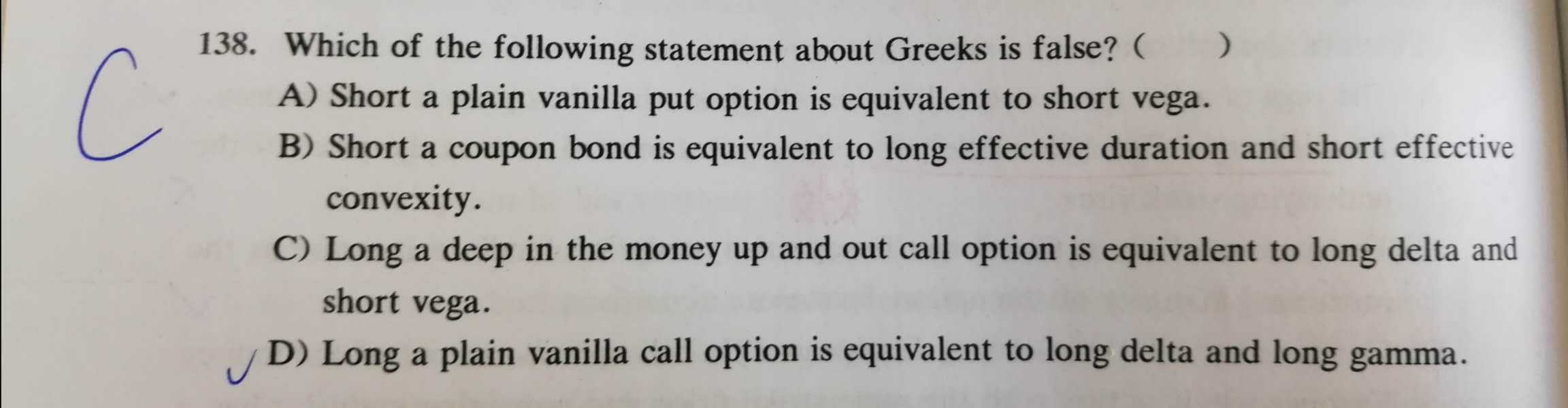 同学你好,关于A选项,short call/put 的vega小于0,所以相当于short vega;关于B选项,债券价格跟久期成反比,跟凸度成正比,所以B对。