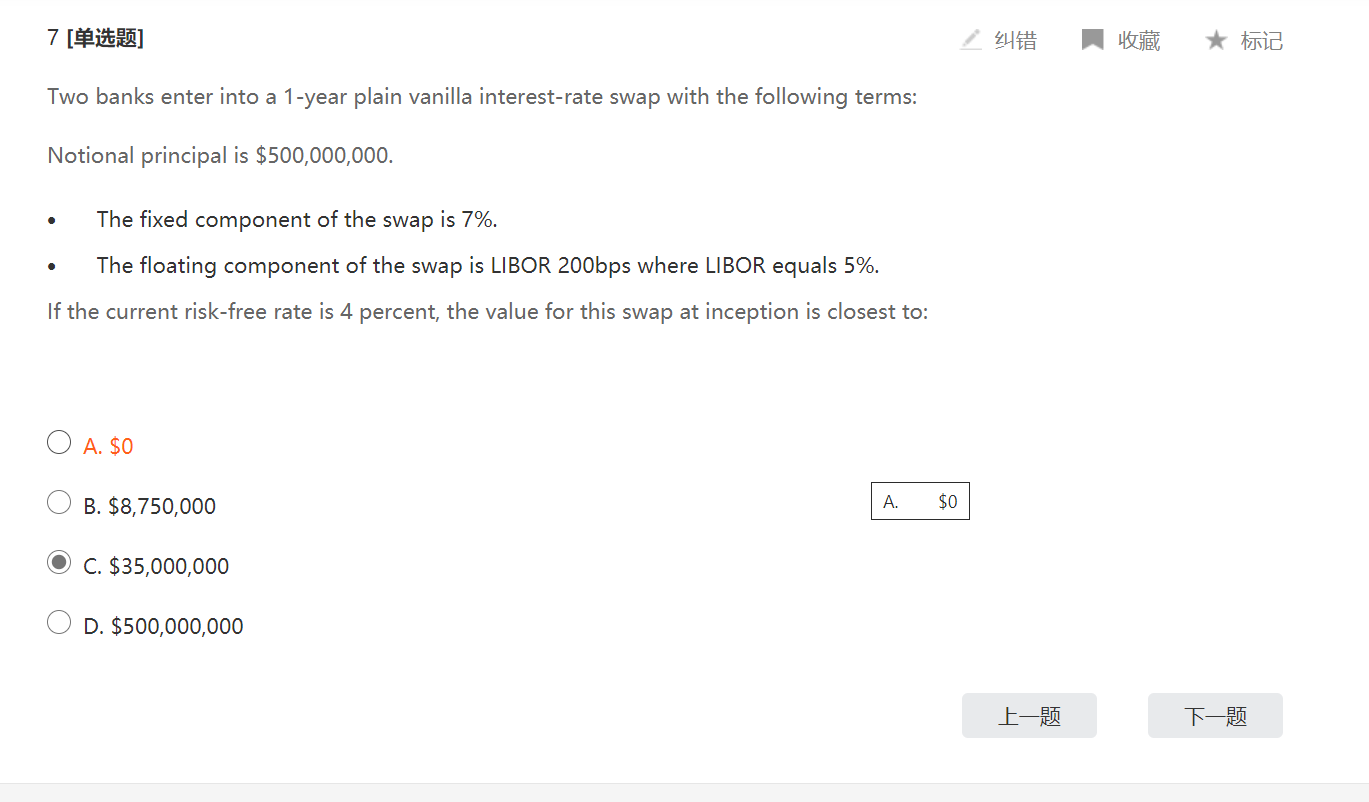 同学你好,互换合约的价值在期初签订是0,这个属于定性考点,直接选A