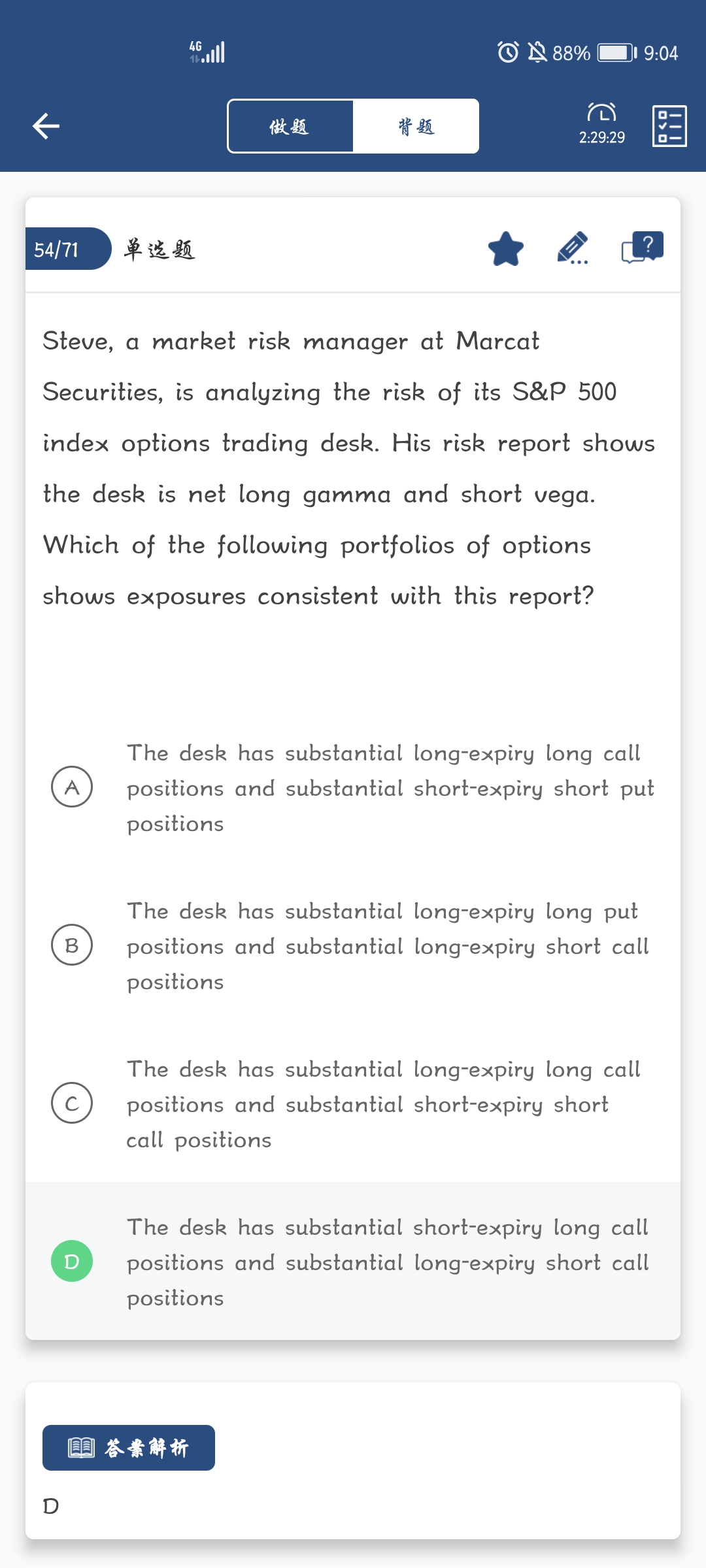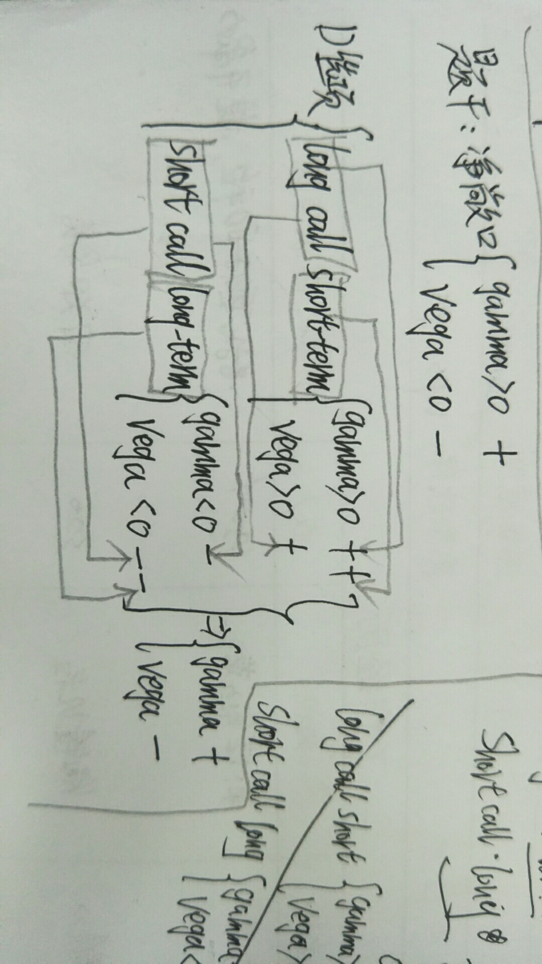 同学你好,首先,详细解析见图片,介绍一下规则,题干中目前的净敞口是正gamma和负vega,标记为gamma +,vega -,其中一个+代表一个正的影响因素,两个加号代表两个正向因素,一个负号代表一个负的影响因素,两个负号代表两个负的影响因素,比如long call对gamma是正向影响,期限越长,gamma越小,所以是负向影响因素,依次类推。