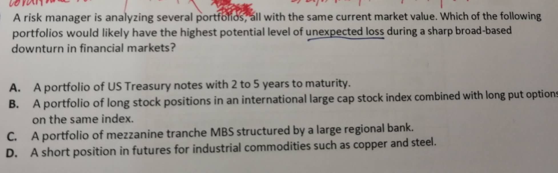 同学你好,非预期损失指的就是在市场下行时出现的极端损失,A选项是国库券,违约概率较低,所以风险较小,即使是在市场下行的时候;B选项因为有对冲措施,所以风险也较低;C选项说的是由一些地区性银行发行的MBS,风险较高,尤其是在市场下行时,借款人的还款很容易出现问题;D选项在市场下行时大宗商品市场价格也会走弱,空头头寸会获益。