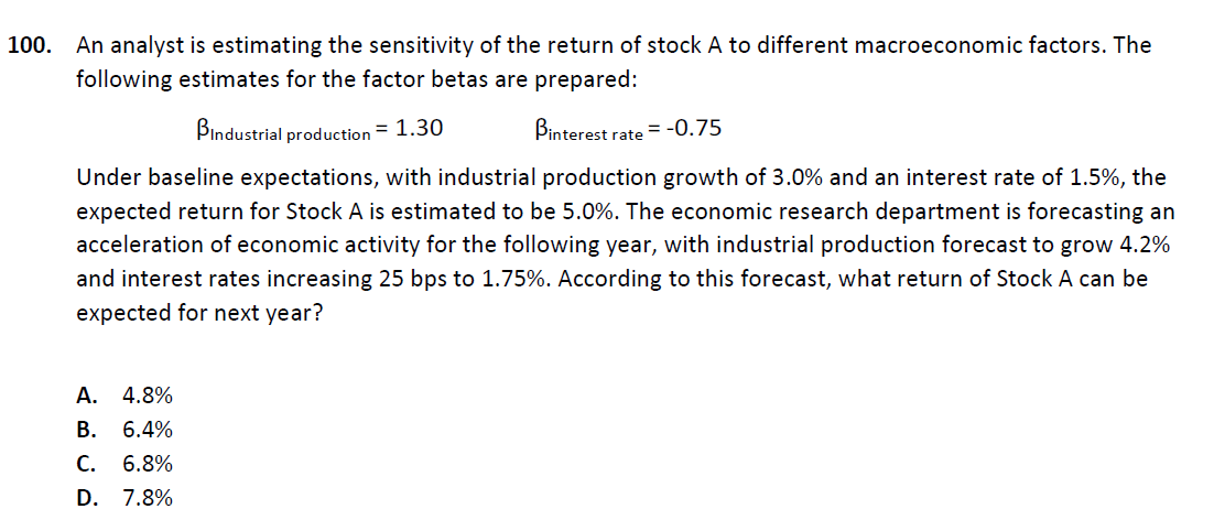 同学你好,这道题就是根据题干条件先算出回归方程的截距项,得出回归方程,第二步根据更新后的自变量带入回归方程算出股票A的预期收益。