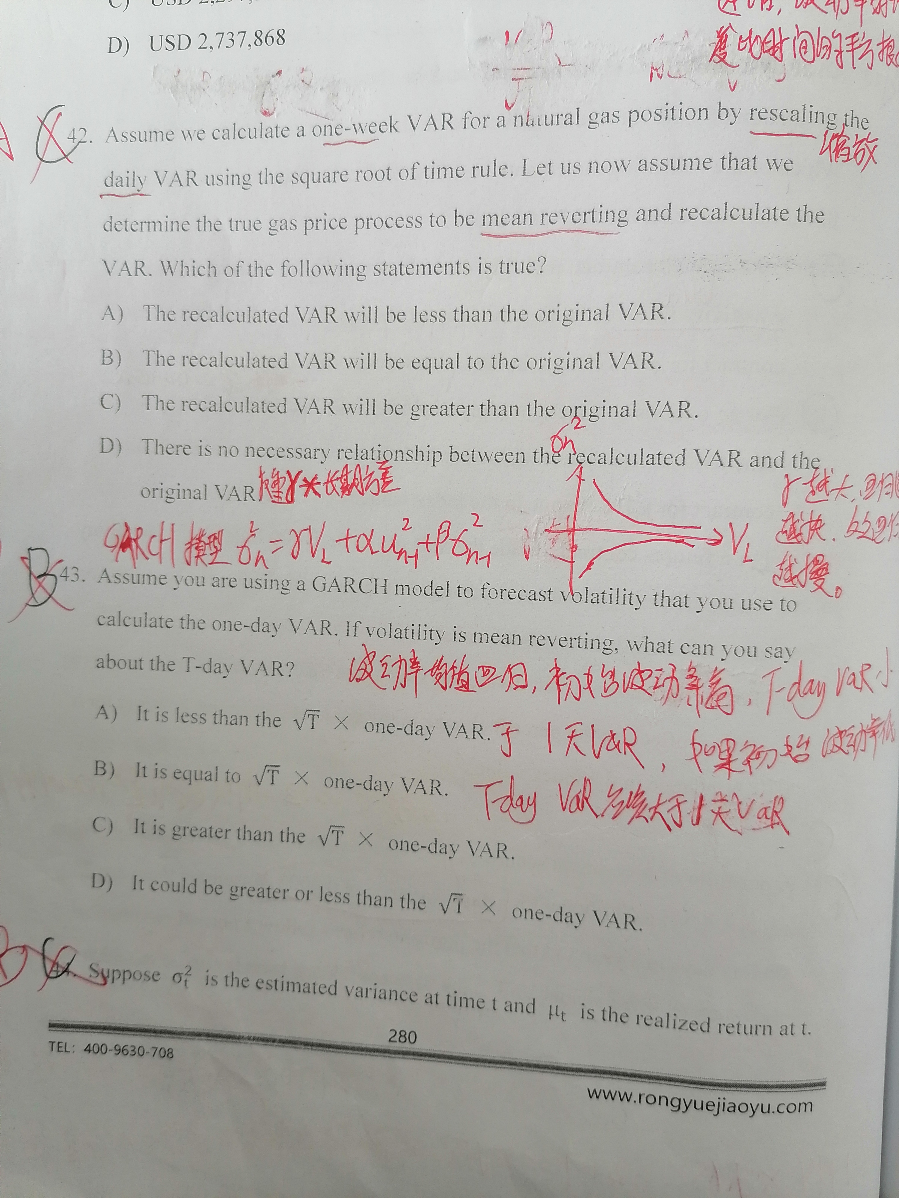 同学你好,第43题的解释,考点:均值复归下的波动率的平方根法则对 VaR 的影响。平方根法则:如果随机过程从一个周期到下一个周期的波动是独立的,则波动率随着时间单位的平方根法则而增加。当波动率存在均值复归时,想要预测未来波动率的大小,必须要知值当前波动率的情况,如果当前波动率高于长期均值水平,则算多期的波动率就会下降,当前波动率就会存在高估,进而 VaR就会存在高估,反之,就会低估波动率和 VaR.由于现在题目没有说明现在波动率是高是低,所以无法判断是高估还是低估。而第42题考察的是收益率存在均值复归时应用平方根法则时对VaR的影响。
