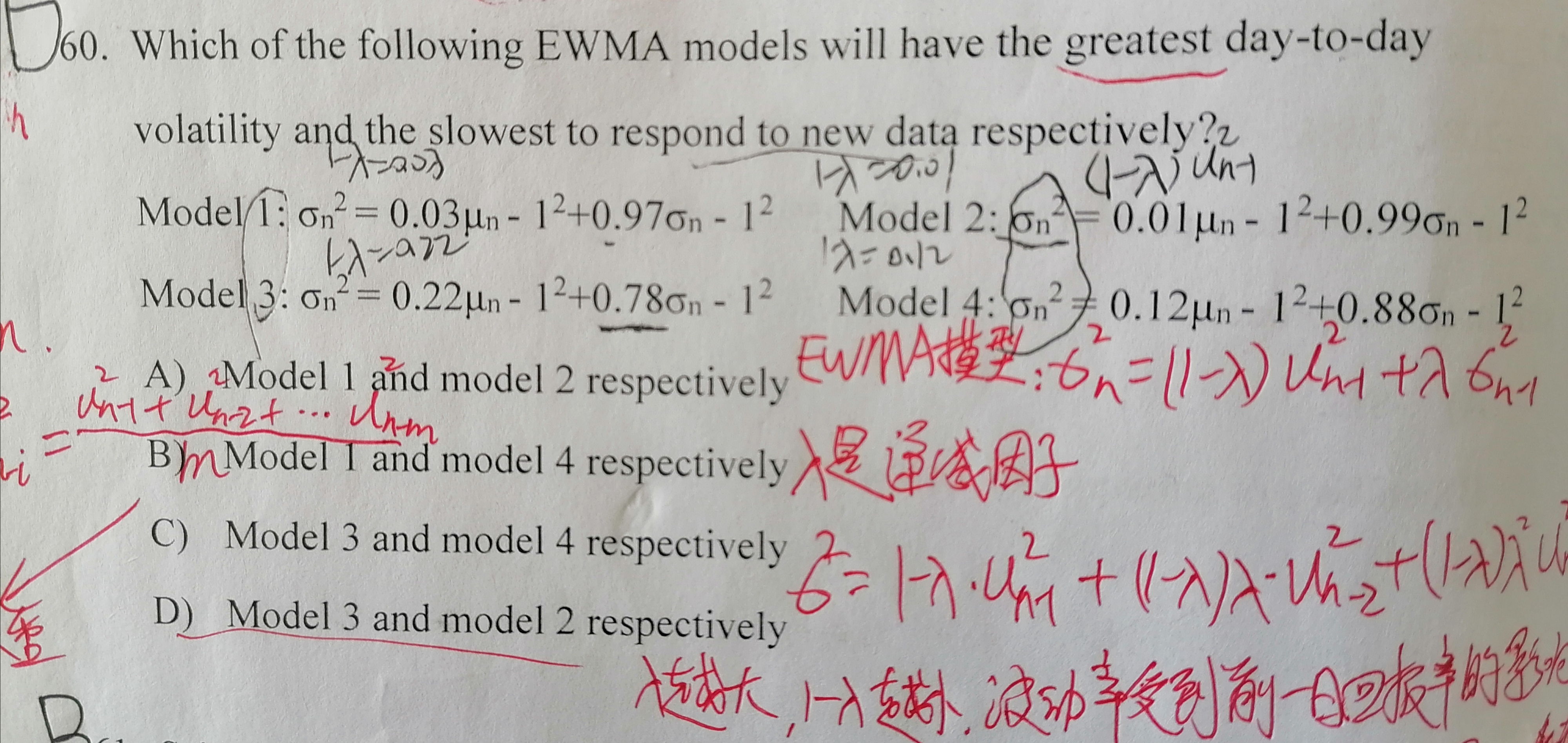 同学你好,在EWMA模型中,上一期的波动率前的参数莱姆达越小,波动率的衰减力度越快,波动性越大。模型3前的参数最小,所以衰减程度最大,波动最大。