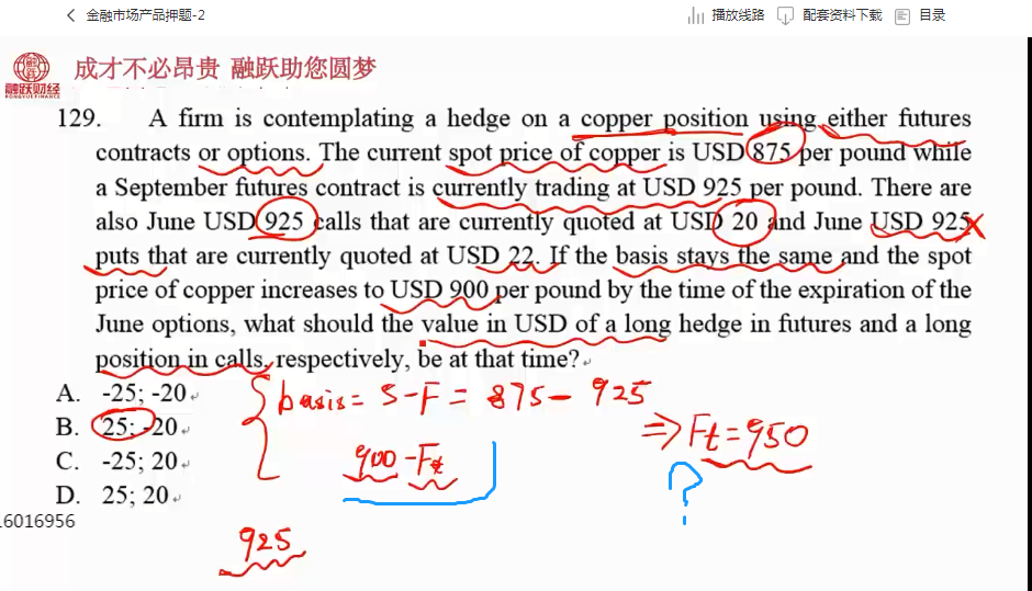 同学你好,这道题从头到尾只做了一次对冲,只是说假如现货价格上升到900而基差保持不变时推出此时的期货价格为950,让计算在此种情况下对冲的收益,目前的期货价格925,现在买入到期以950卖出,在期货市场赚取25元利润。