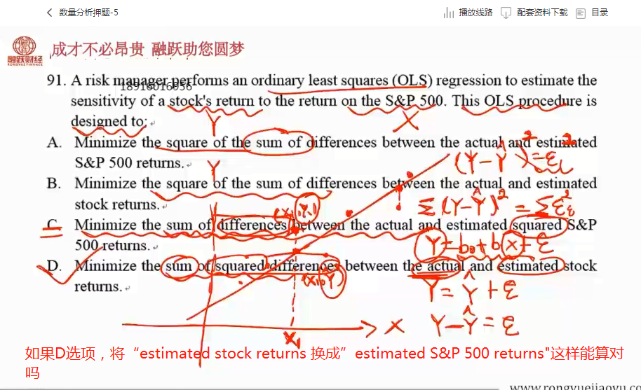 同学你好,你在图片中说的情况不对,因为最小二乘法的最终目的是让回归的股票收益与实际收益之间的差异最小,跟标普500指数没有任何关系,标普500只是一个影响因素。