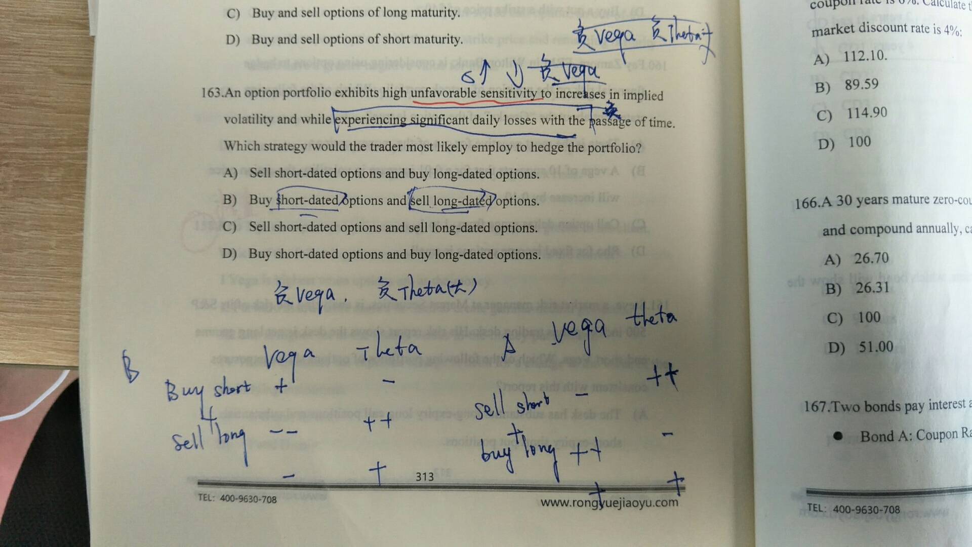 这个题目首先注意,波动率上升,价格上涨,只有空头才不希望价格上涨,Vega为负,theta也为负,分析过程参考下图,A,B为例子
